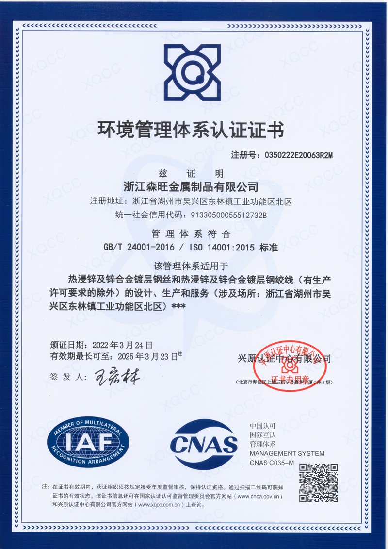 浙江森旺金屬制品有限公司成立于2012年,坐落湖州市吳興區(qū)東林鎮(zhèn)工業(yè)功能區(qū)。公司專業(yè)從事各類鍍鋅鋼絲、鋼絞線等產(chǎn)品的開發(fā)及生產(chǎn)。目前產(chǎn)品已廣泛應用于各類通信光電纜,電力輸送,電氣化鐵路工程,各類堤壩防護及農(nóng)業(yè)溫室等工程領域。公司秉承“追求卓越品質,創(chuàng)建卓著信譽”的經(jīng)營理念,始終堅持專業(yè)化、規(guī)模化的經(jīng)營模式。